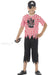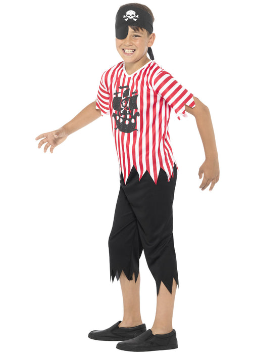 Jolly Pirate boy fancy dress costume consisting of red and white striped top with pirate ship print, black elasticated 3/4 trousers, black skull print bandana & black eyepatch.