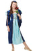 This girls Juliet fancy dress costume includes a dark blue velour style dress with detailed draped sleeves and gold embroidery trim. The center panel of the dress is a light blue satin style fabric finished off with a black and gold corset style tie. A matching headpiece with a long mesh trim is also included.