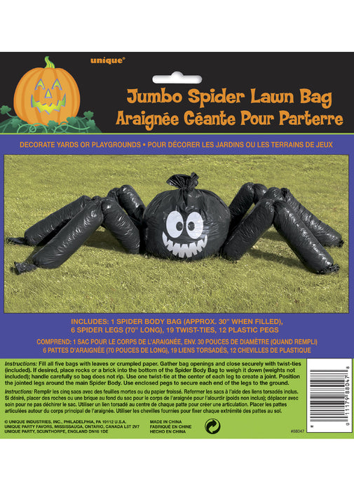Jumbo spider lawn bag Halloween decoration. Includes 1 x spider body bag (approx 30in/77cm when filled), 6 spider legs (70in/178cm long), 19 twist ties and 12 plastic pegs.