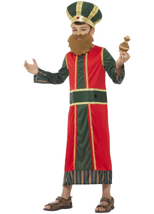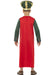 Deluxe King Casper costume consisting of full length red, green and gold trimmed robe with detachable Frankincense bottle, layered felt beard and green and gold king's crown.