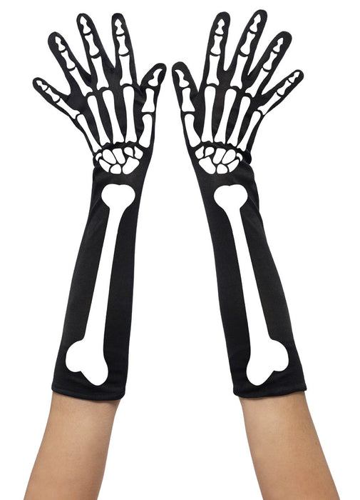 Long Halloween female skeleton print gloves. One size fits most. Made from 100% nylon.
