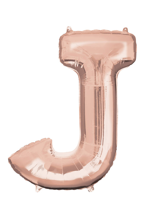 Letter J rose gold super shape foil balloon measuring 86 cm (34") in height when inflated.