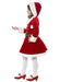 Little Miss Santa child's costume consisting of layered red dress with white faux fur trim with hood.