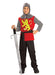 Medieval Lord children's knight fancy dress costume with red tunic printed with large lion, hood and waist sash. Model is wearing own black trousers.