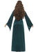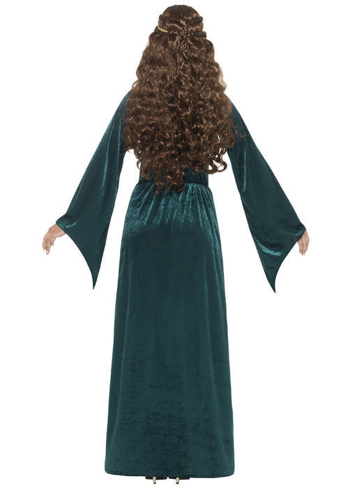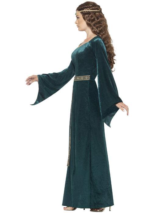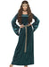 Medieval Maid fancy dress costume consisting of long green velvet effect dress with gold waistband & matching gold headpiece with green jewel.