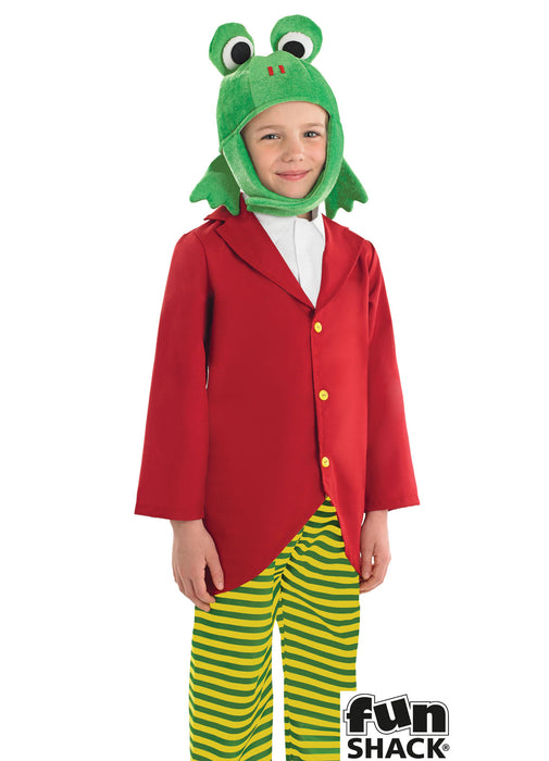Child's Mr Frog fancy dress costume as seen in Wind And The Willows. Costume pack includes red jacket with white shirt insert, green and yellow striped elasticated trousers & frog headpiece.
