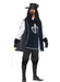 Musketeer costume consisting of long velvet effect top decorated with white frilly draped sleeves and collar, hat with attached white feather, pair of black gloves and matching boot covers & beard and moustache set.