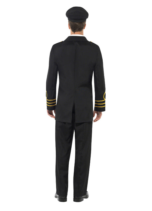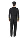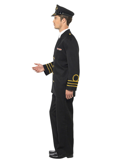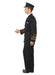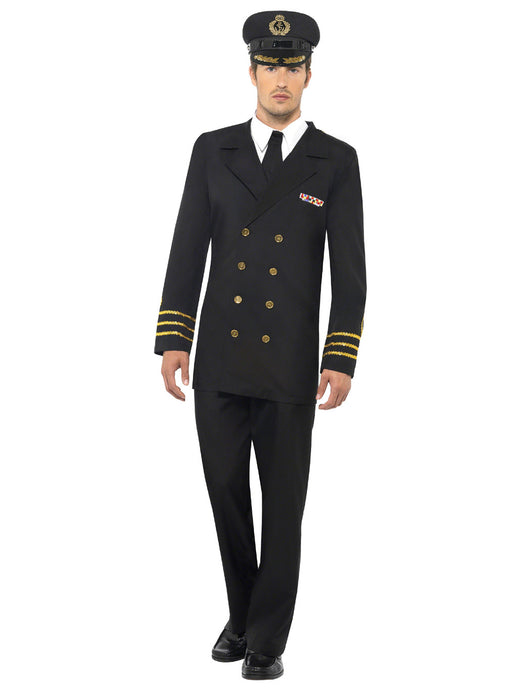Naval Officer costume in black which includes double buttoned jacket with gold insignia on the cuffs and medal badge, a pair of black trousers with elasticated waist, mock white shirt and tie and peaked military hat with badge.
