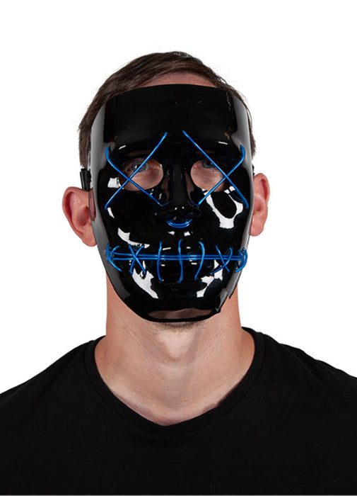 Halloween horror neon blue light up black plastic face mask. Super scary on a dark Halloween night!