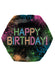 Neon design Happy Birthday large balloon measuring 55 cm x 58 cm (22 in x 23 in) when inflated.
