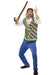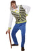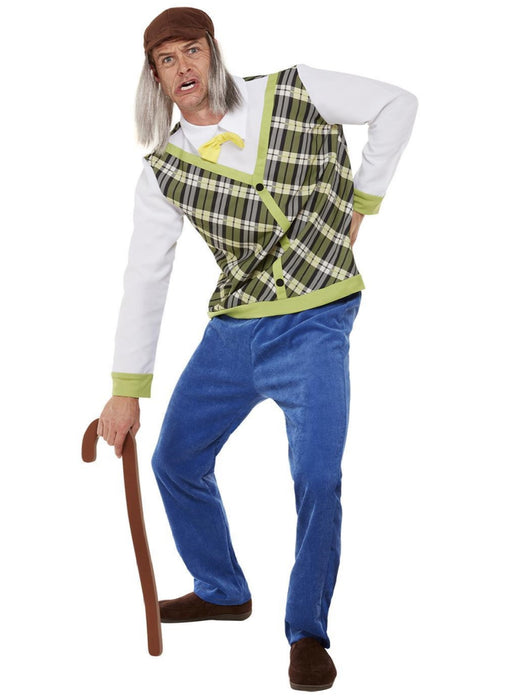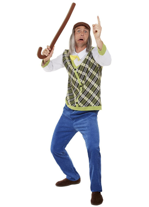 Comedy old man fancy dress costume containing faux cardigan top, blue trousers, cane and hat with grey hair.