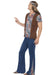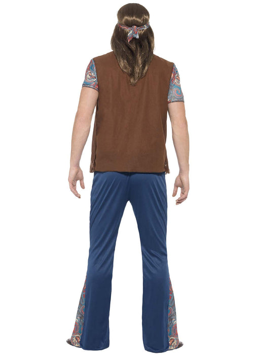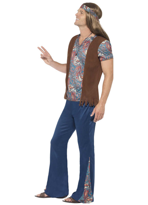 Orion the Hippie fancy dress costume consisting of paisley print top with attached brown waistcoat, blue elasticated trousers, matching headscarf & peace medallion.
