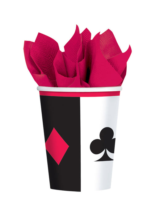 Pack of 8 place your bets casino theme paper cups decorated with red, white and black card design.