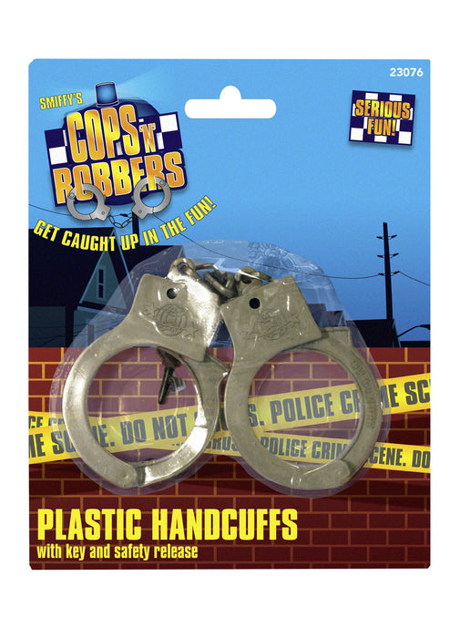 Pair of police convict plastic toy handcuffs with safety key.