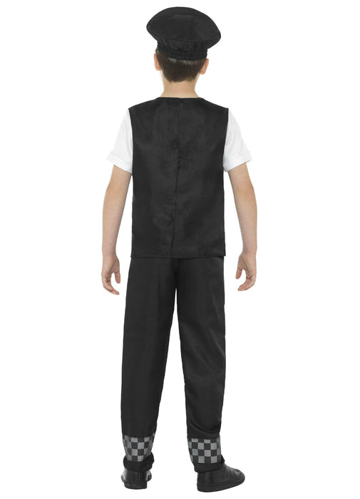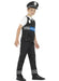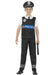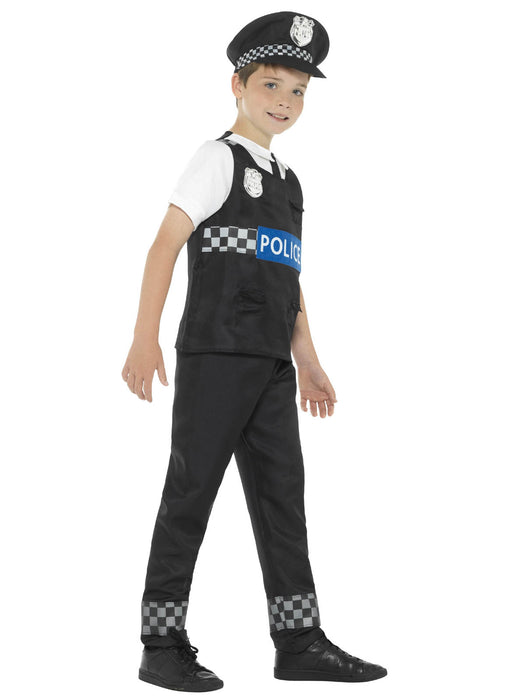 Modern British style 3-piece policeman costume with top with attached badge and mock shirt and tie, trousers with checkered pattern at bottom and cop hat.