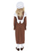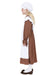 Poor Victorian girl fancy dress costume consisting of long brown and white dress with apron look front and finished with a white bow on the back along with a traditional looking white mop hat.