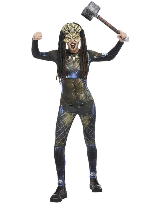 Halloween Predator Alien costume consisting of all in one deluxe printed jumpsuit and latex face mask. Please note pictured hair is a dreadlocks wig which is not included in costume pack but is available.