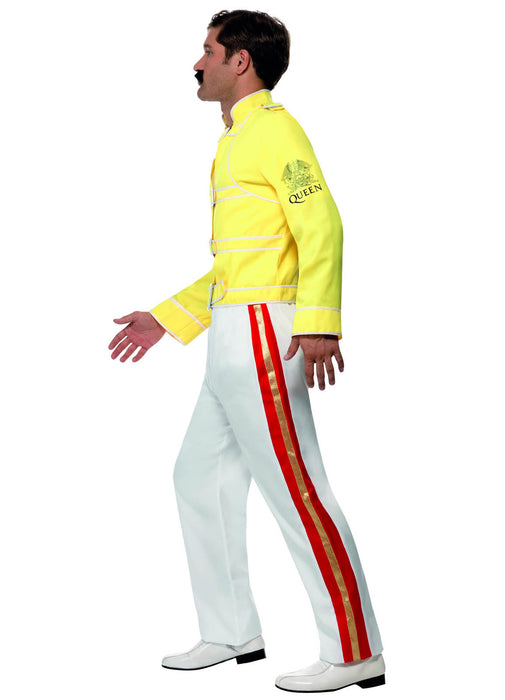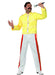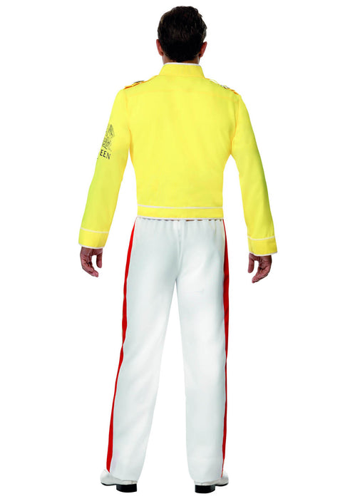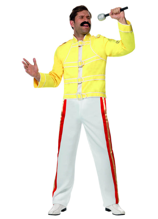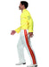 Officially licensed Queen costume of the outfit worn by Freddie Mercury at Wembley in the infamous 1986 concert. Consists of yellow jacket and red striped white trousers. Add a tash to finish the look!