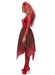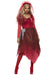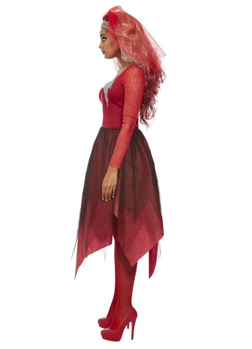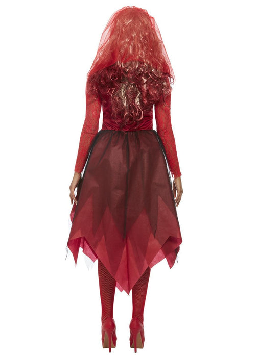 Ladies Graveyard Bride Halloween costume consisting of long red dress with red lace sleeves & torn grey gauze trim. Also included is the red rose headband with attached red veil.