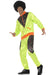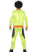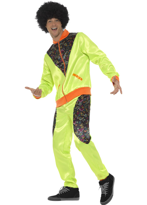 1980's retro shell suit fancy dress costume consisting of bright green shell suit with orange collar and trim & retro multi colour design panels.