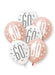 Pack of 6 age 60 Birthday Rose Gold Glitz 12" latex pearlised balloons in assorted colours. Printed all over. Supplied deflated and suitable for air or helium inflation.