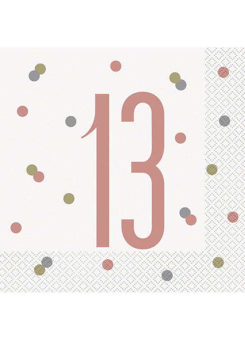 Click to expand Tap to zoom Rose Gold Glitz Age 13 Birthday Napkins Save £-1.99 £1.99 SKU U84878 1 2 3 4 5 6 7 8 9 10+ Quantity Quantity ADD TO BASKET Pack of 16 luncheon 13th Birthday Rose Gold Glitz napkins. 2 ply. 33 x 33cm.