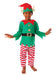 Child's Elf fancy dress costume consisting of red and white striped elasticated trousers, green elf's top with red collar and gold material buttons & matching hat with attached elf ears.