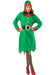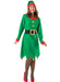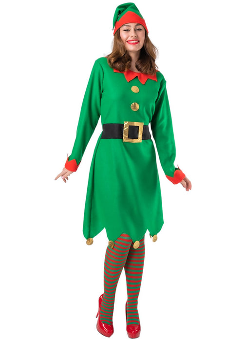Ladies Christmas Elf costume with green dress and attached faux belt and hat with bell.