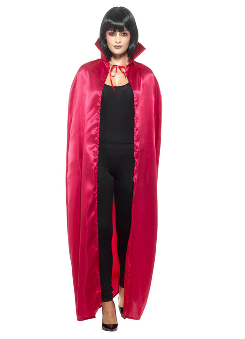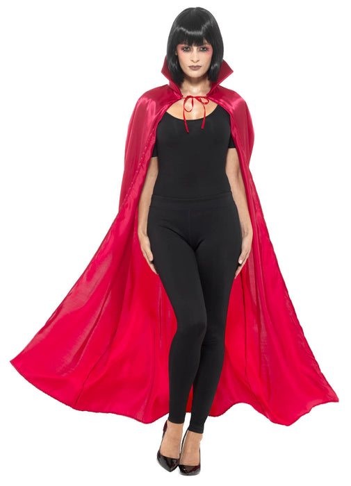 Long red satin Halloween devil cape with collar measuring 144 cm/ 57 inches.
