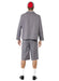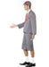 Outfit includes grey trousers, blazer with attached shirt front and tie and school boy cap.