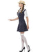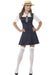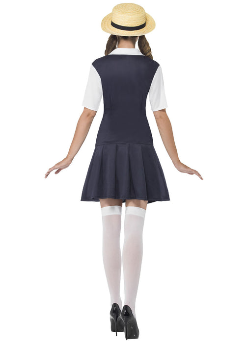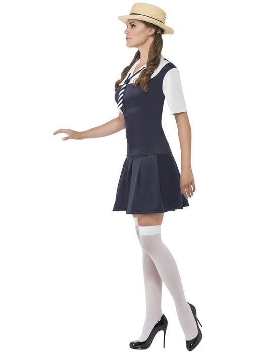 School girl costume adult consisting of navy blue dress with attached shirt section and decorated with blue buttons, elasticated blue and white striped tie & straw boater hat to complete the look!