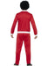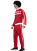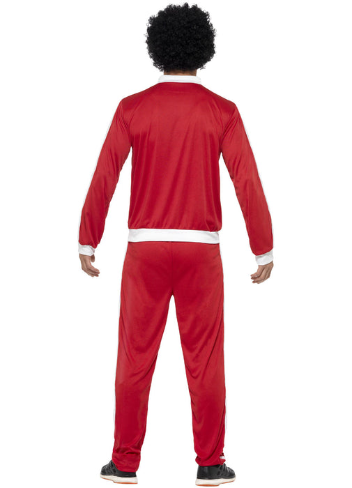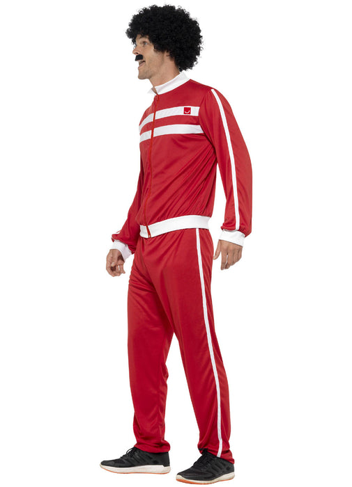 1980's style Scouser tracksuit costume consisting of red elasticated trousers with white stripe & matching zip up tracksuit jacket.