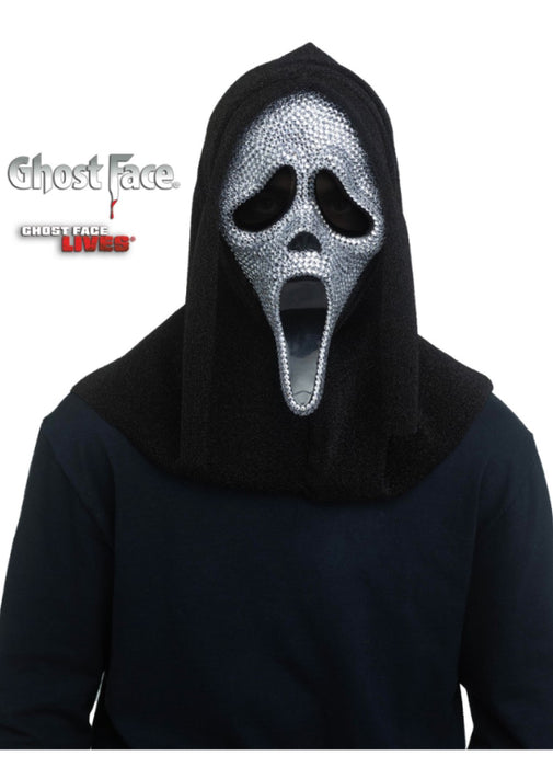 Officially licensed Scream Ghost Face bling crystal mask with shimmer black hood.