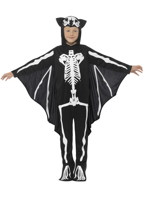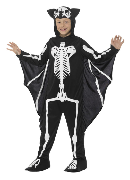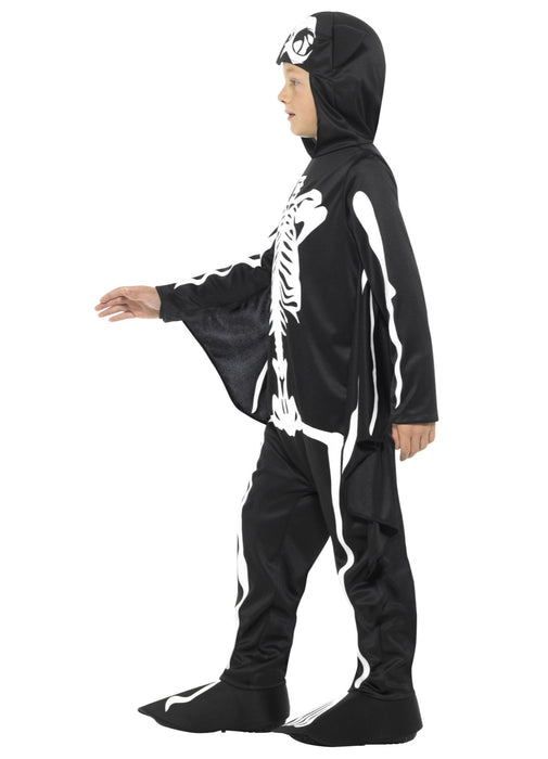 Children's Halloween bat skeleton fancy dress costume with hooded bodysuit and attached wings.