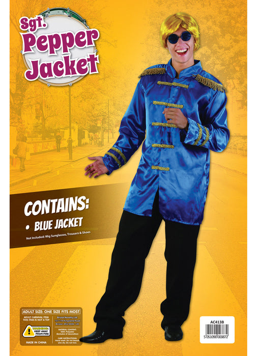 Sergeant Pepper Beatles fancy dress costume consisting of long blue jacket with gold trim decoration and stand up collar.