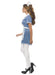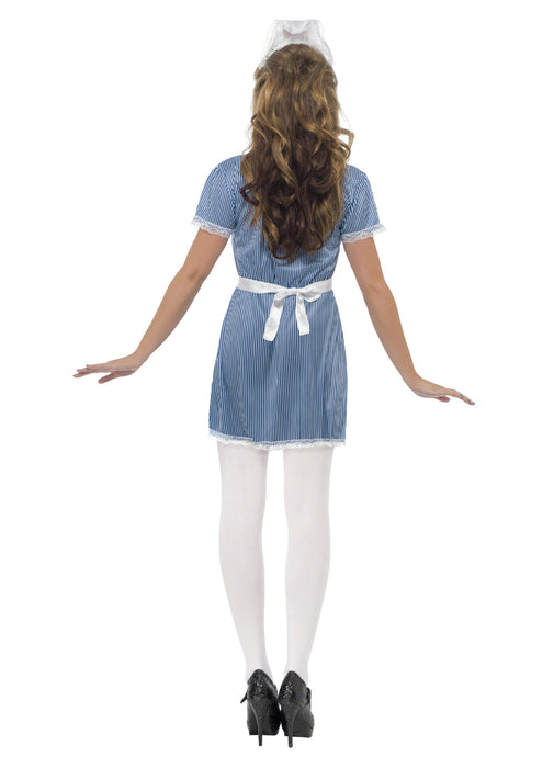 Naughty nurse blue and white costume with apron and hat. White tights available separately.