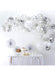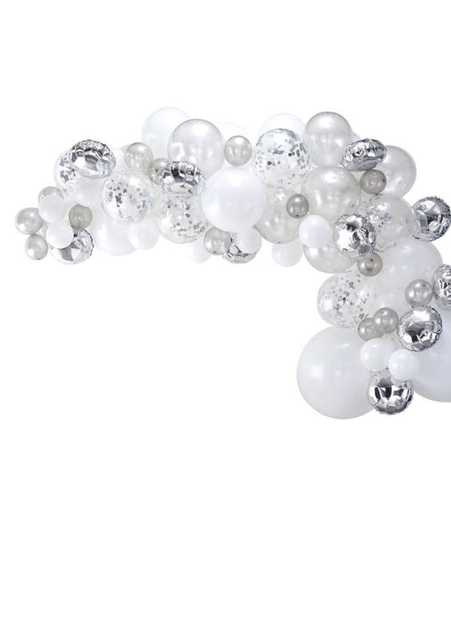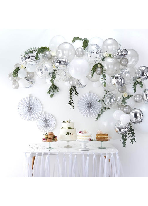 Easy to assemble balloon arch kit consisting of 70 silver and white balloons of various sizes, 4 metres of balloon tape and easy to follow instructions.