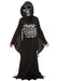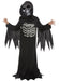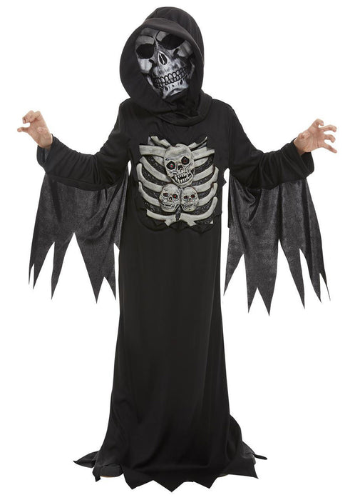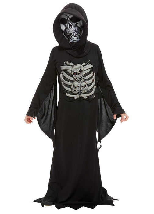 Grim Reaper costume with long black robe with rib cage chest piece and printed hooded mask.