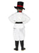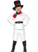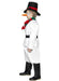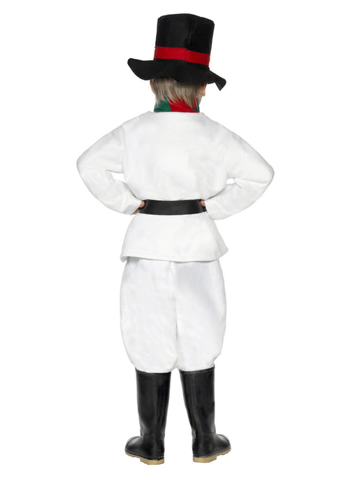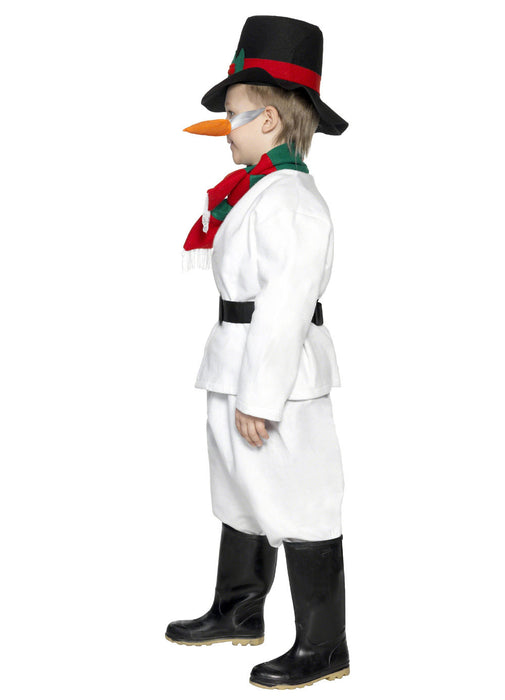 Child's Snowman costume with white top, white trousers, black belt, hat, red and green scarf and carrot nose.