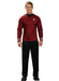 Red shirt printed in a pin pattern with black collar and printed silver pin emblem.