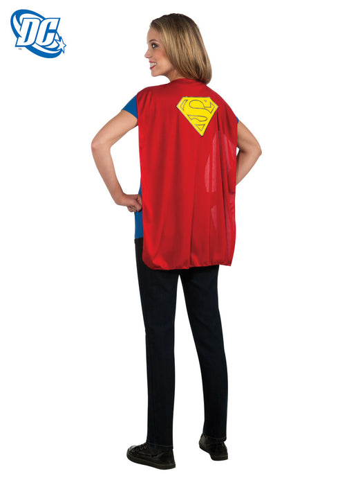 Official Licensed Supergirl set adult consists of blue t-shirt with printed superman logo and chest design and red cape.