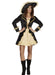 This Swashbuckler ladies pirate fancy dress costume includes black and gold dress with attached jacket finished with gold trim and lace with gold corset style ribbon to the front. Also comes with matching large pirate hat.