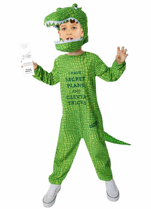 Roald Dahl officially licensed The Enormous Crocodile kids fancy dress costume with jumpsuit, headpiece, tail and bookmark.