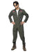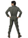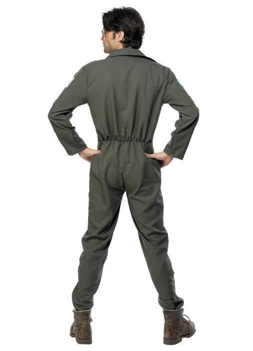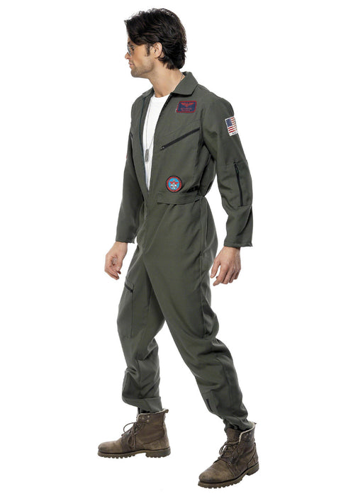 Officially licensed Top Gun pilot costume consisting of quality khaki jumpsuit with badges, a pair of silver framed mirror sun glasses along with three different name badges.