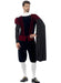 Deluxe Tudor Lord costume consisting of velvet effect red and black top with puffed shoulder cuffs, elasticated trousers, side shoulder cape & white neck ruffle.