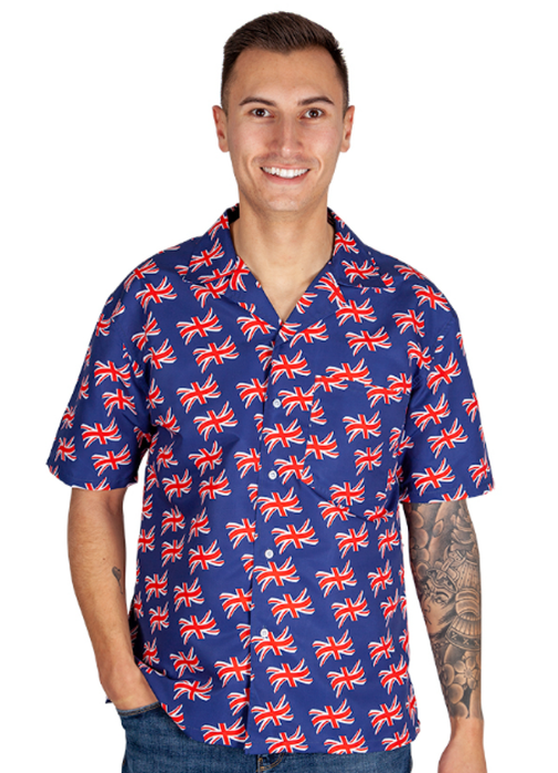 Great Britain fancy dress buttoned blue shirt with Union Jack flag design available in 4 sizes.