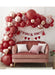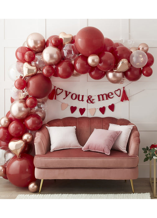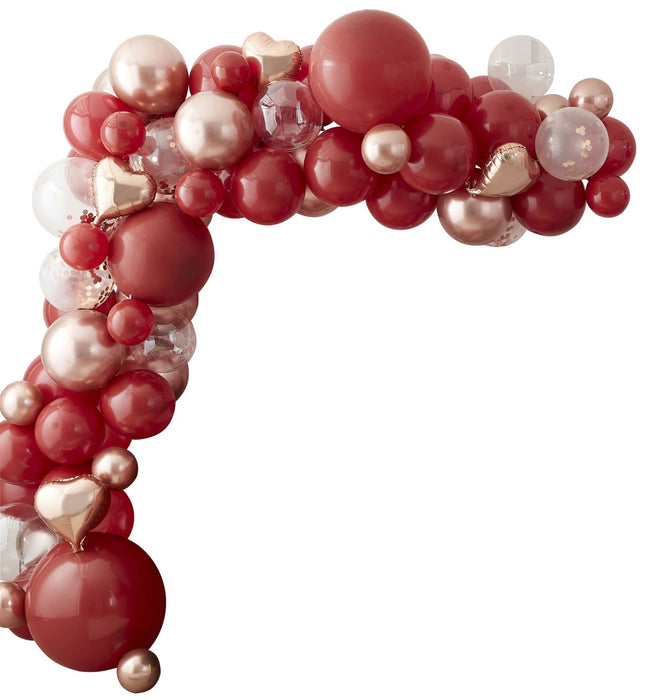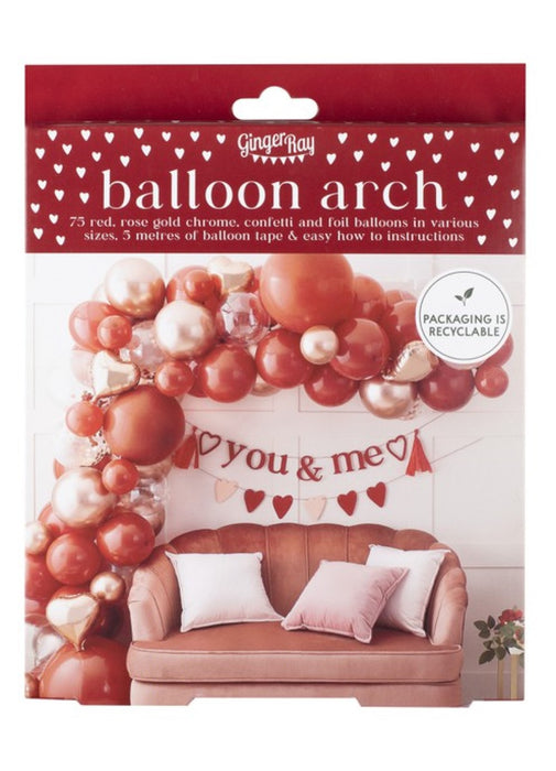 Easy to assemble balloon arch kit consisting of 58 red and rose gold chrome balloons of various sizes (5 inch, 10 inch, 12 inch 18 inch and 24 inch), 7 rose gold confetti 12" balloons, 5 rose gold heart 9" foil balloons, 5 clear orb 10" balloons with 5 metres of balloon tape, 40 glue dots, 5 metres of twine for hanging, a straw to inflate and easy to follow instructions.