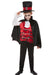 Traditional Vampire Halloween 3-piece costume with all in one top with ruffle neck piece, black cape with jewel and matching material top hat.