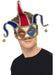 Red, cream and blue Venetian musical jester eye mask with gold trim, black tie up lace & dangling bells.