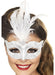 Venetian silver glitter eyemask decorated with central pendant & white feathers.